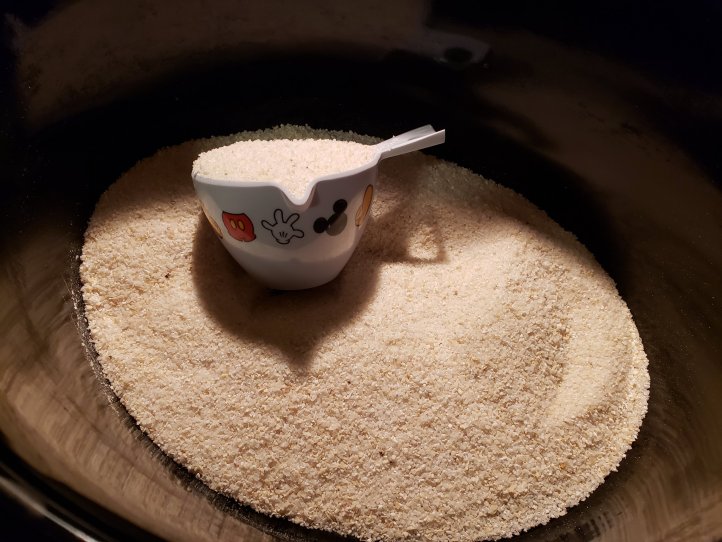 Grits are added to the crock along with salt and bacon crumbles.
