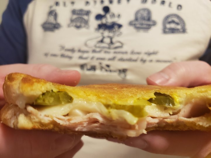 I call this the Orlando. Not quite as fancy as the Cuban sandwiches of Miami. Also, much less pork-y. Turkey, swiss, pickles, mustard. You could do a simple grilled cheese, or go as fancy as you would like! Get creative.