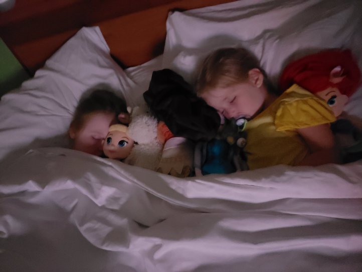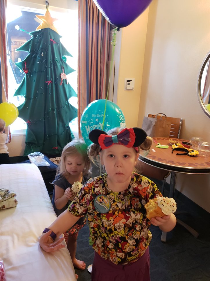 Snacking on treats that a wonderful MouseKeeper brought for us. She also brought birthday pins and balloons and let the girls “work” with her.