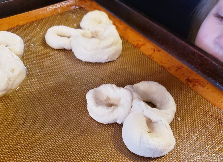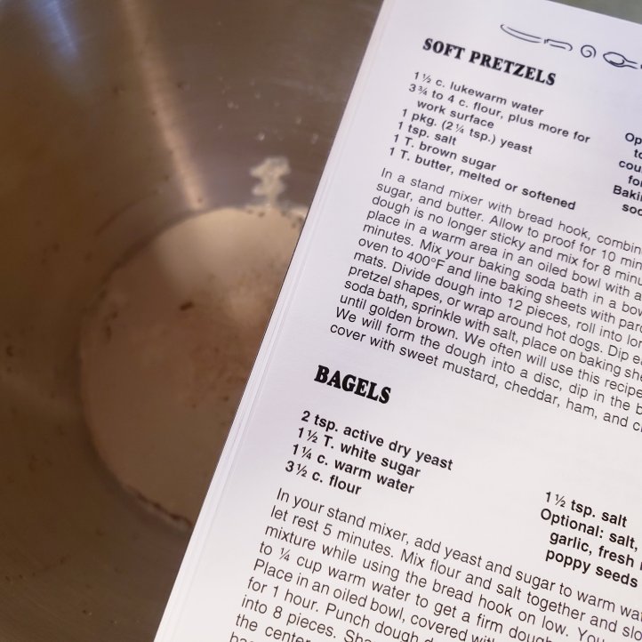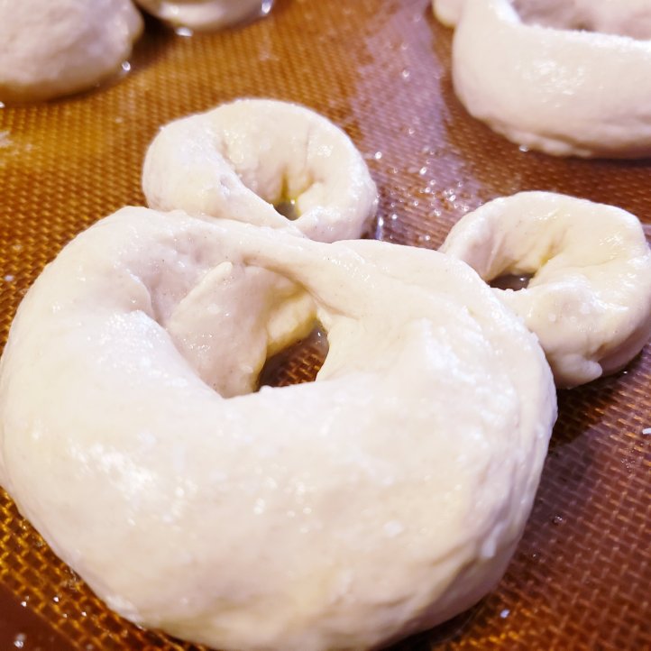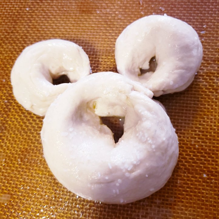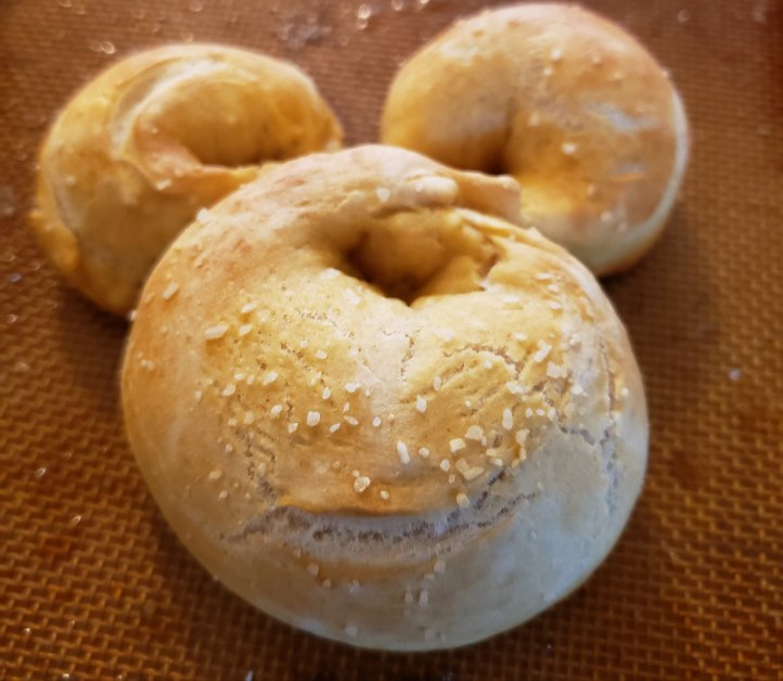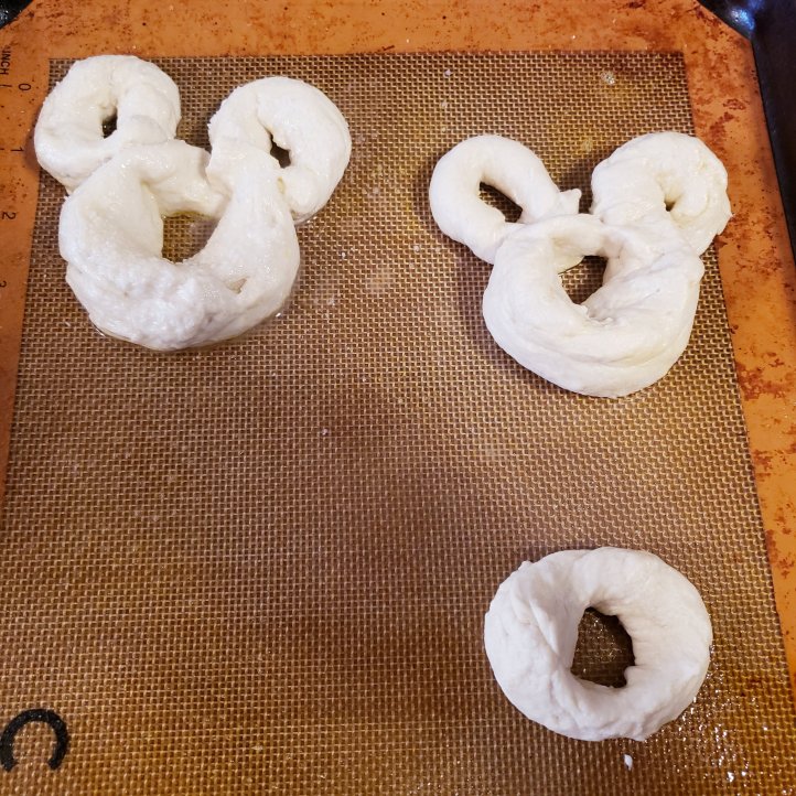 In a stand mixer with bread hook, combine yeast, water, salt, sugar, and butter. Allow to proof for 10 minutes. Turn mixer on low and add flour slowly until dough is no longer sticking to the bottom of the bowl, then mix 8 minutes. Shape into a ball and place in a warm area in a covered, oiled bowl, for 10 minutes. Preheat oven to 400F and line 2 baking sheets with parchment or silicone baking mats, spraying each lightly with baking spray. Prepare baking soda bath in a shallow bowl. Divide dough into 10 pieces – you will get 10 Mickey pretzels from this recipe. With each piece of dough, divide the dough in half, then divide one half again, giving you one large and two smaller pieces. Roll each piece into a snake. Wrap the largest piece around all 4 of your fingers, overlap the ends, and pinch it shut. Wrap the two smaller pieces around just 2 fingers, overlap the ends, then pinch each shut. Now lay your larger ring down and place the two smaller rings in ear placement. Pinch each ear to the head. Dip each pretzel into the baking soda bath, sprinkle with salt, bake 12-15 minutes until golden brown. If you would like them to have a shine, in the last minute or so of baking, spray with baking spray.