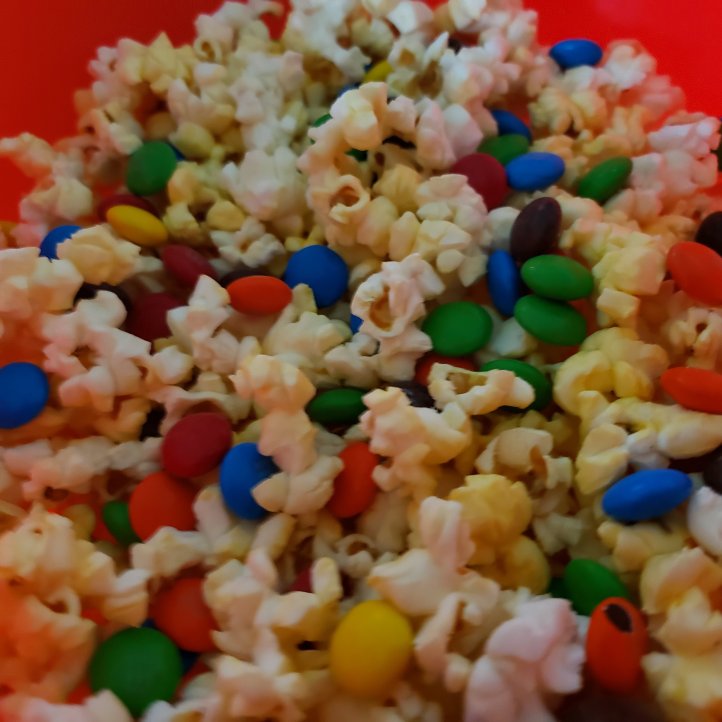 While Mr. Mouse was out, I whipped up a quick bowl of popcorn with m&ms and dubbed it Up-corn. (1 bag microwave popcorn, popped, 1/2 cup m&ms on top, or more to your liking) The m&ms look like little balloons on a pile of popcorn clouds. We threw in Up and that set our evening mood.