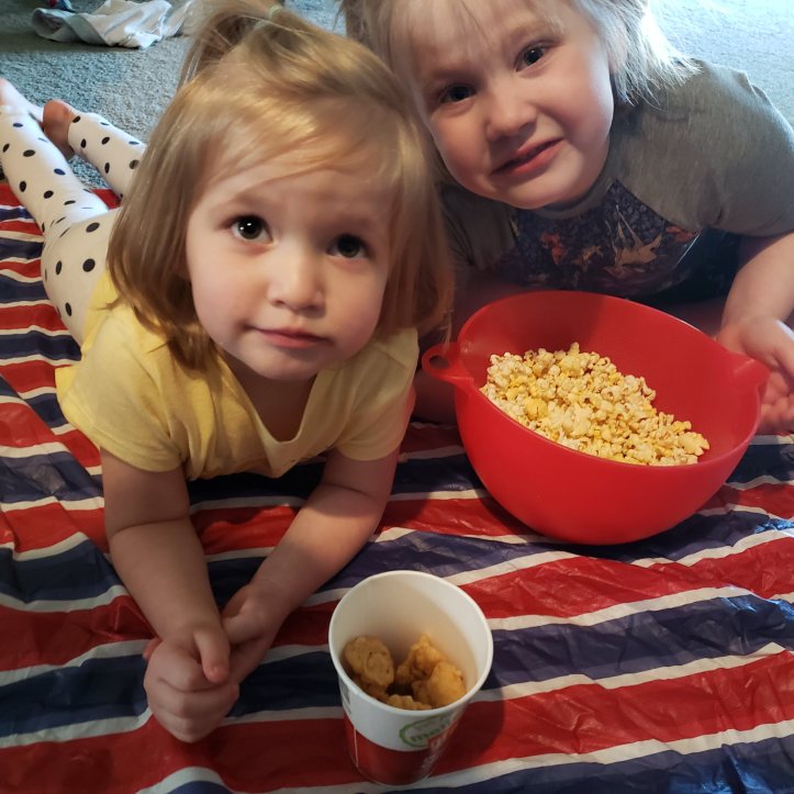 Sneaky girls ate all the m&ms off the top! Enjoying a picnic of popcorn chicken and up-corn.
