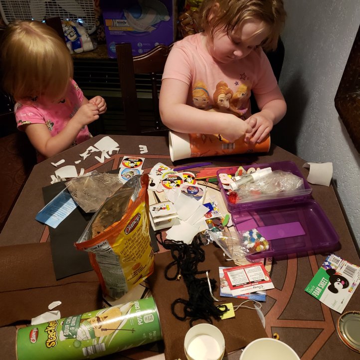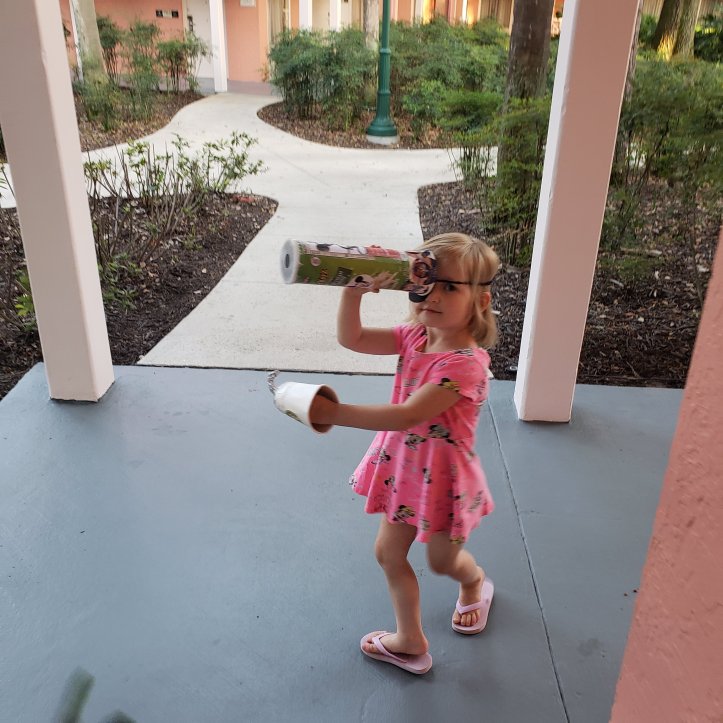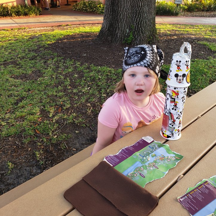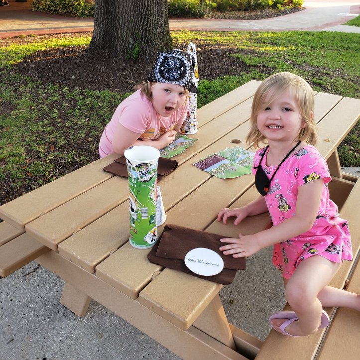 Staying in the pirate rooms at Caribbean Beach gave me the idea to have a pirate craft day. I saved Aldi pringles cans from throughout the trip, paper cups, all the stickers Cast Members give the kids, a few plastic hanger tops and foil from home, and various this n that’s to give the girls lots of space to be creative. (I packed a pencil case with glue, scissors, tape, gems, sequins, etc…)
