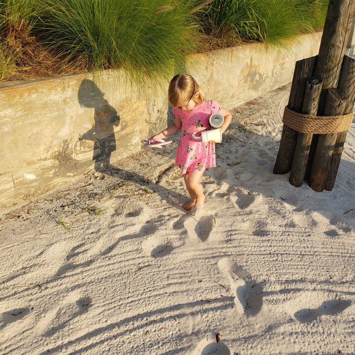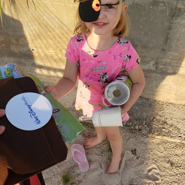 I then cut the bottom off the cup and fit the cup into the can. A quick go round of tape and the spyglass was ready for the girls to coat in whatever stickers, etc… they wanted!V. Mouse getting ready to craft.Snacking and stickers kept these girls happy, quiet, and fight free for a long long time!Treasure chests made from felt. To make 2 chests, I used 3 pieces of felt. I cut one piece in half and glued around the edges to make a pocket, then cut curved edges around it to make it look more like a chest. A few swipes of glue just above the pocket and the girls could add tons of gems, sequins, and bits of foil for treasure. V. Mouse filled her pocket with coasters and popsicle sticks.You can see the girls adding their gems to the chests. The hooks are also seen here. I cut a slit in the top of the cup, wrapped the top of a kid’s hanger in foil, and stuck it through the slit. Bits of string and black foam made for extremely sparkly eye patches once the girls got their hands on some glue.I grabbed a few maps from the front desk, tore the edges off, and made an X marks the spot!Pirate V, hook in hand, spyglass and eye patch ready to go! Mommy Mouse hid the treasure chests and 2 pirates need to go find them.It sure is hard to see out of your spyglass when it is backwards and your eye is covered with a patch.Off we go. Following the map.Pirate E prefers a bandanna on her head to an eye patch.Getting closer.Off through the sand.Almost found the treasure.There it is!Pirate V is super excited to find her treasure!Now for pirate E to find her treasure chest.Through the pool.In the Spyglass restaurant, behind the plinko game.Showing off all her pirate gear.See mine!Mom, this was so cool!