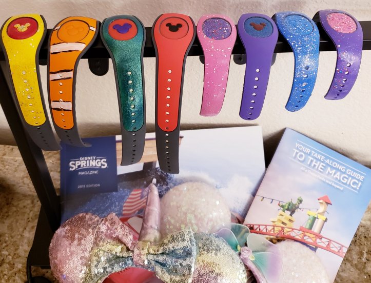 For a quick craft, grab some nail polish and upgrade your Magic Bands. Glitter nail polish and solids (especially black, white, red) can create a variety of looks in minutes. I tend to buy whatever polish I can find in the $1-$2 range, although I did splurge for the mermaid green($3!)