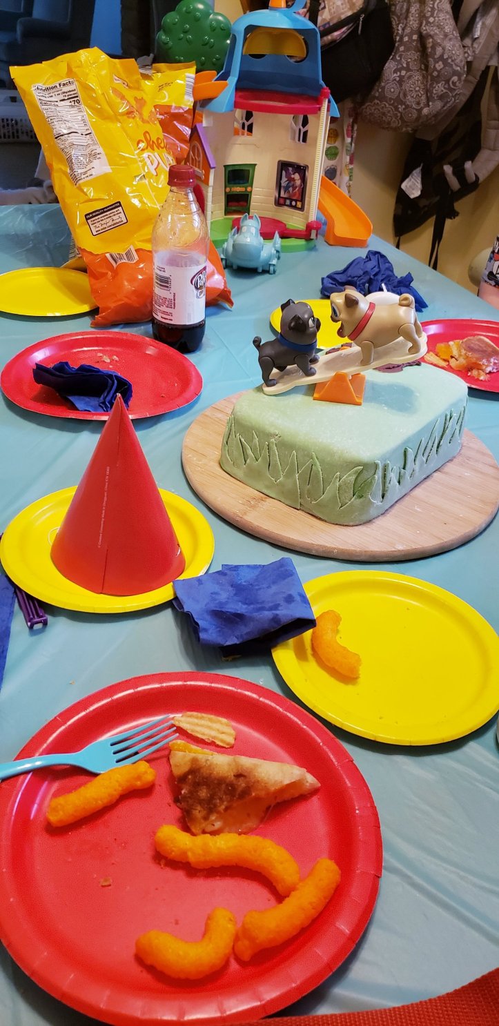 Then, as one of our presents, I bought the only on theme playset I could find. I plopped Bingo and Rolly on the teeter totter on top of the cake(we made our own by slicing a 9×13 in half and stacking it up, but you could use a store bought cake or even cake mix), set the rest of the playset on the table, and tada, the party was set! We even streamed the theme song off our Amazon Primemusic!