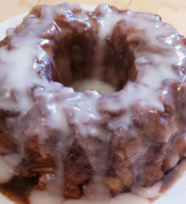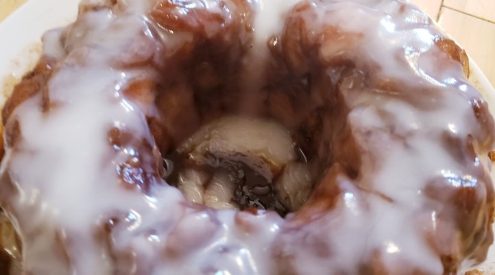 Before you leave home, toss brown sugar, cinnamon, and salt together in a gallon zip lock and label it. When ready to prep, cut your biscuits in quarters. Cinnamon rolls will fall into 12+ pieces after that cut. Enjoy! More pieces, less work, another cinnamon roll win. Toss dough in sugar to coat and pour everything into the bundt, making sure it’s level. Cut butter into thin slices and lay evenly over top. Pour water over everything. Microwave 6 or so minutes, or until just cooked. Let set for 5 to 10 minutes before inverting on a plate. At this time, if you notice it is undercooked anywhere, you can microwave another minute or so. Top with luscious cinnamon roll frosting. Indulge. But only on vacation, ok? Or holidays. Or birthdays. Or on the weekend because everyone is home.