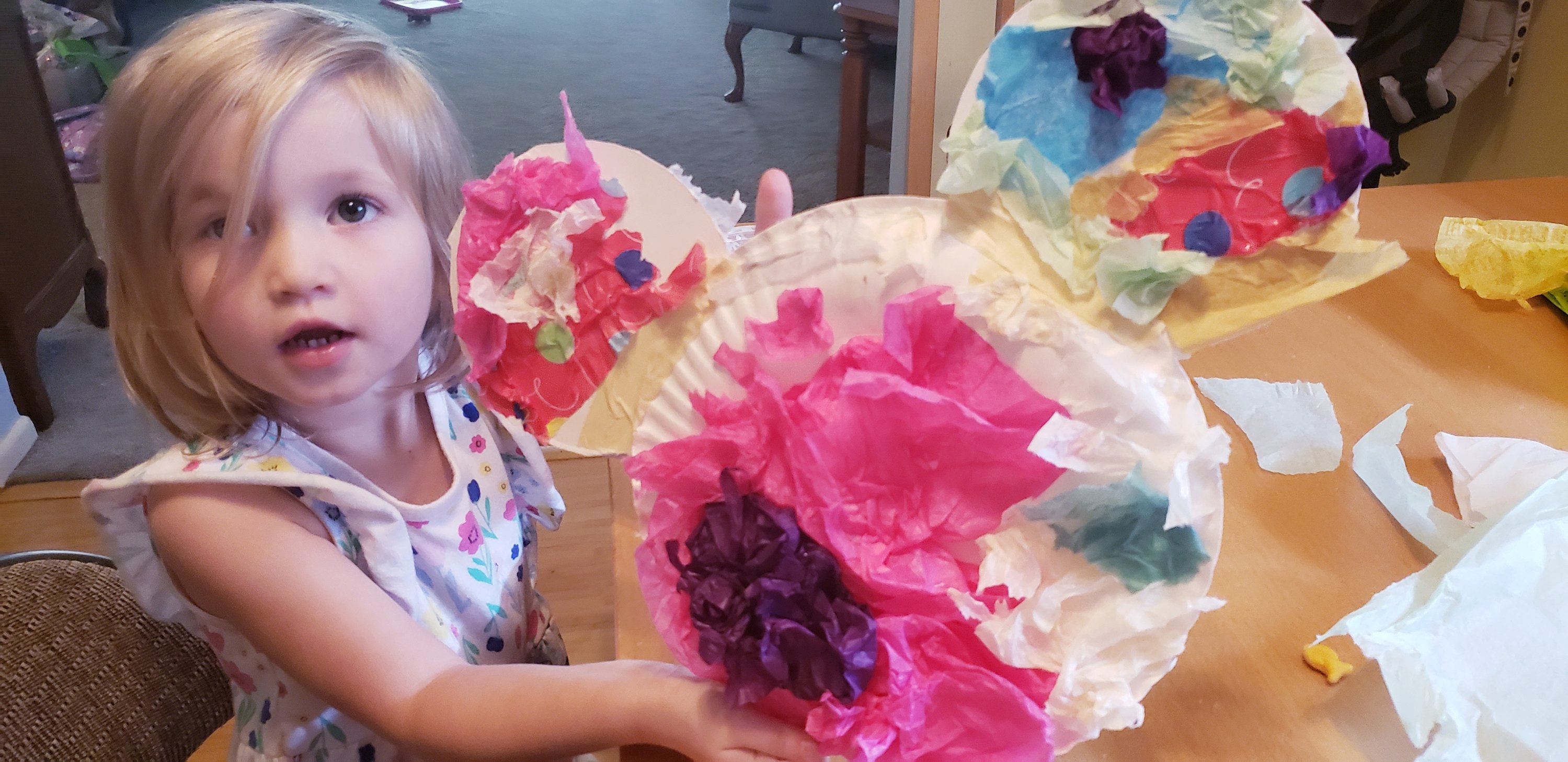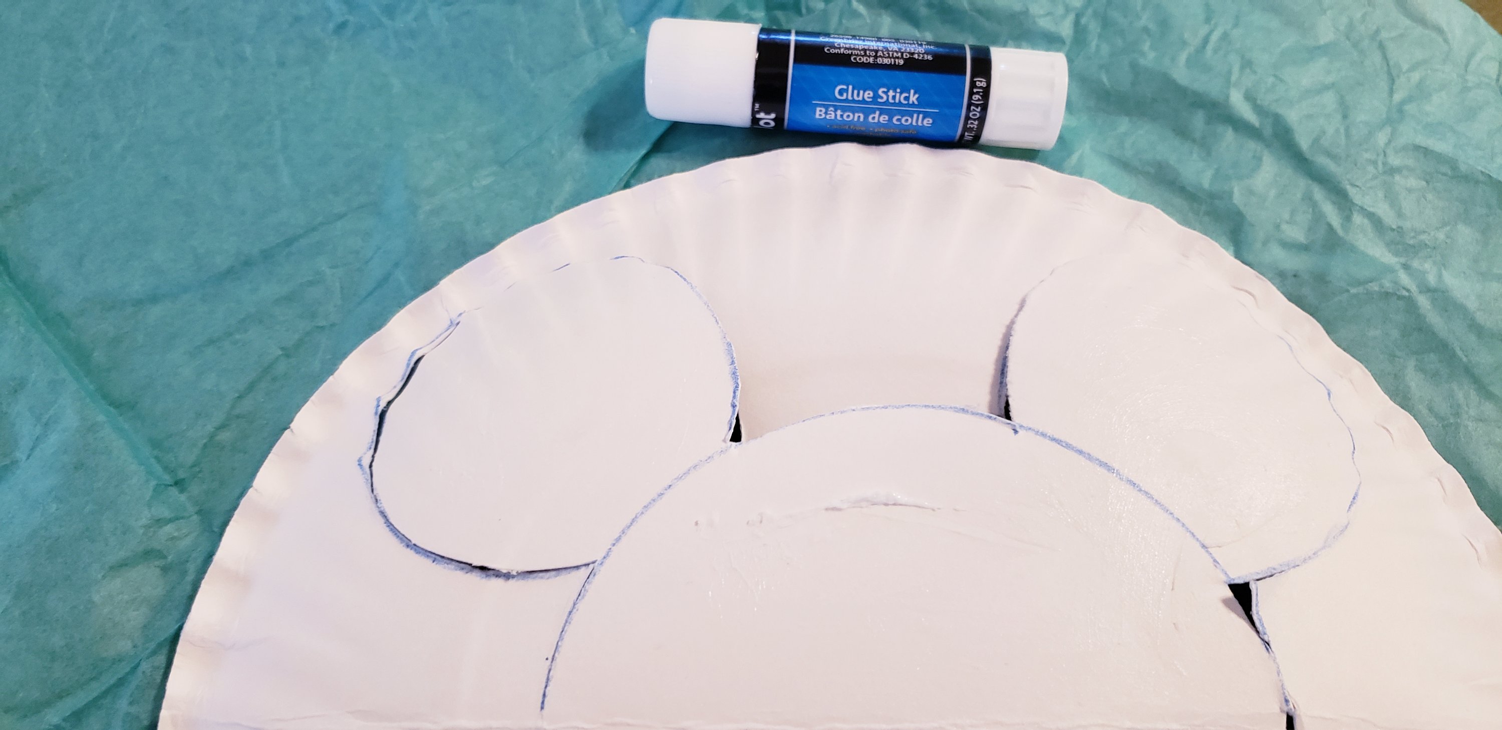 E. Mouse helped cutCut the center section from 2 platesPlace where you would like them with a larger plateTape ears to back side. Tape a piece of string across to hang it withUse either a glue stick or glue/ paint brush to slather glue all over your Mickey head. Attach pieces of tissue paperLook how proud V. Mouse is of hersOnce dry, trim around the grass to remove excess paper. Two complete Mickey wall hangingsHang up in the kids room/ hotel room. Aren’t we proud?