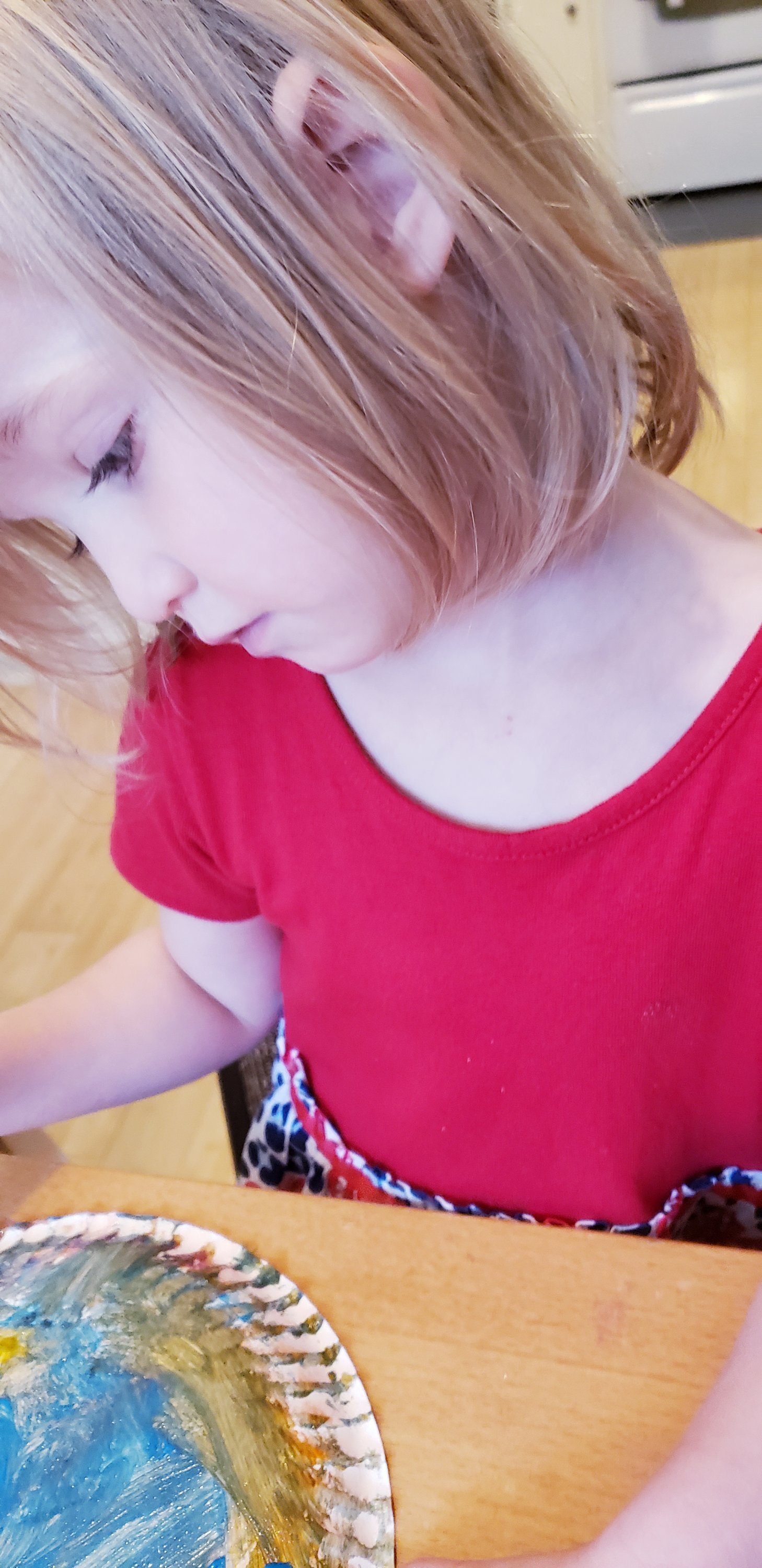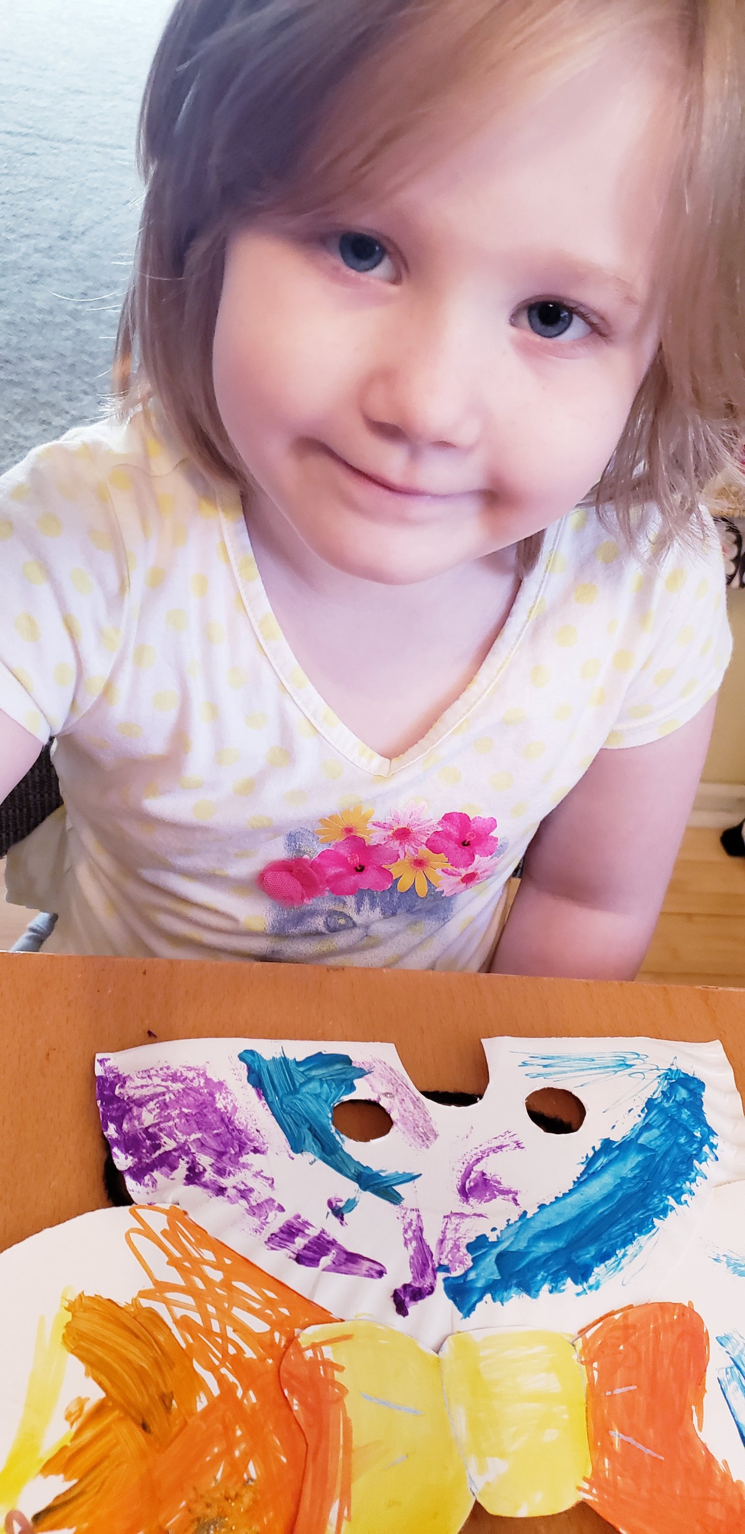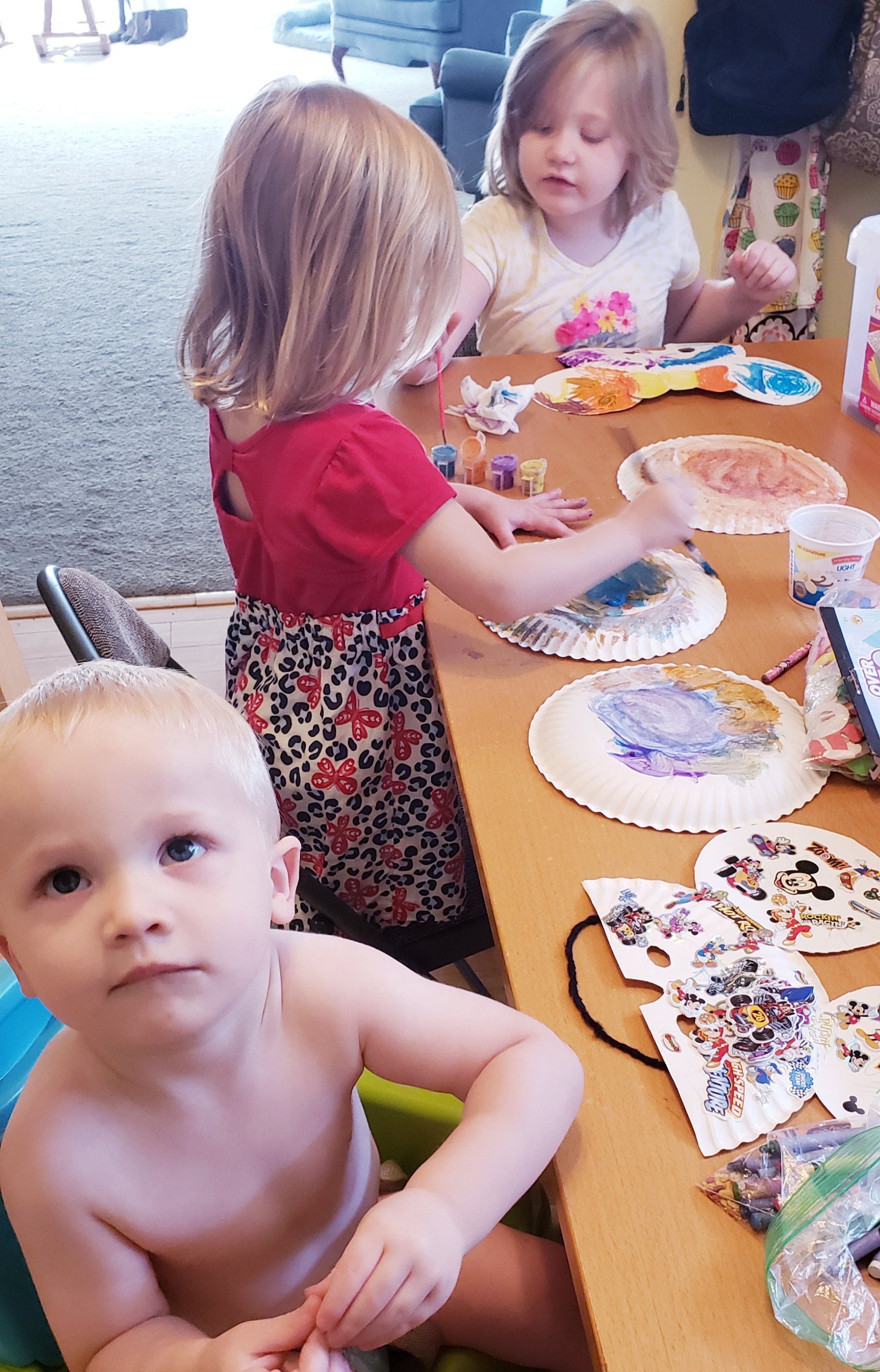 Cut a paper plate in half. Cut out a nose hole and two eye holes. Cut the centers out of two more plates. Cut two slits about 3 inches long along the both sides of the top rim of the plate. Slide edge of ear in, tape on back side. Tape a string to it to strap around your child’s head. T. Mouse looks mighty fine! So does E. MouseKids getting crafty T. Mouse used lots of stickers and a bit of crayon E. Mouse used marker, crayon, and paintV. Mouse used paint and a few stickers. I cut hers out after she painted. Masks complete. Now to get an actual picture of the kids wearing them…