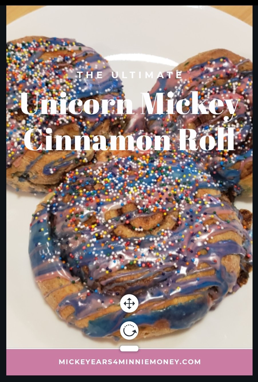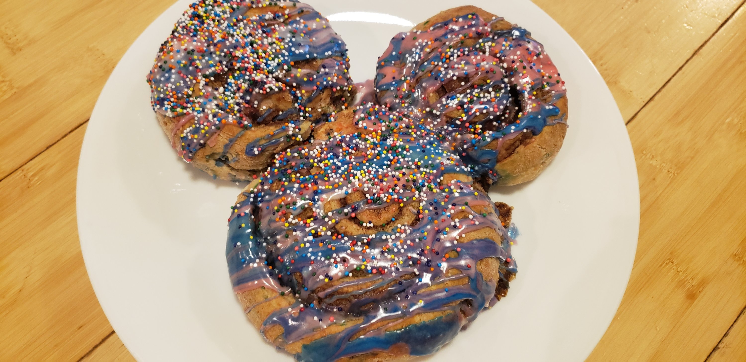 Cut salt, baking powder, and nonpareils into flour. Then cut shortening in. Gently stir milk in, mixing minimally. Flour surface, fold dough a few times. Cut in half. Working with each half separately: Roll into a rectangle, about 8in x 10inTop with half the butter, brown sugar, and cinnamon. Add nuts if desired. Cut into 4 pieces length-wise. Roll one strip up for each ear. For the head, roll one strip up, then roll the next strip around it. Place them into a Mickey shape on a parchment coated baking sheet. Press down a bit. Bake in a 475F preheated oven for 10 minutes, or until golden, brown, and delicious. In a bowl, combine powdered sugar, salt, orange extract, and milk until smooth. Add 2 drops on food coloring for each color. We used purple, pink, and blue. Stir carefully each color. Do your best to not mix it with the other colors. Drizzle that gorgeous icing all over your cinnamon roll. Sprinkle with more nonpareils. Now get ready for Instagram praise! This baby is ready for the spotlight. And it is super yummy, too!