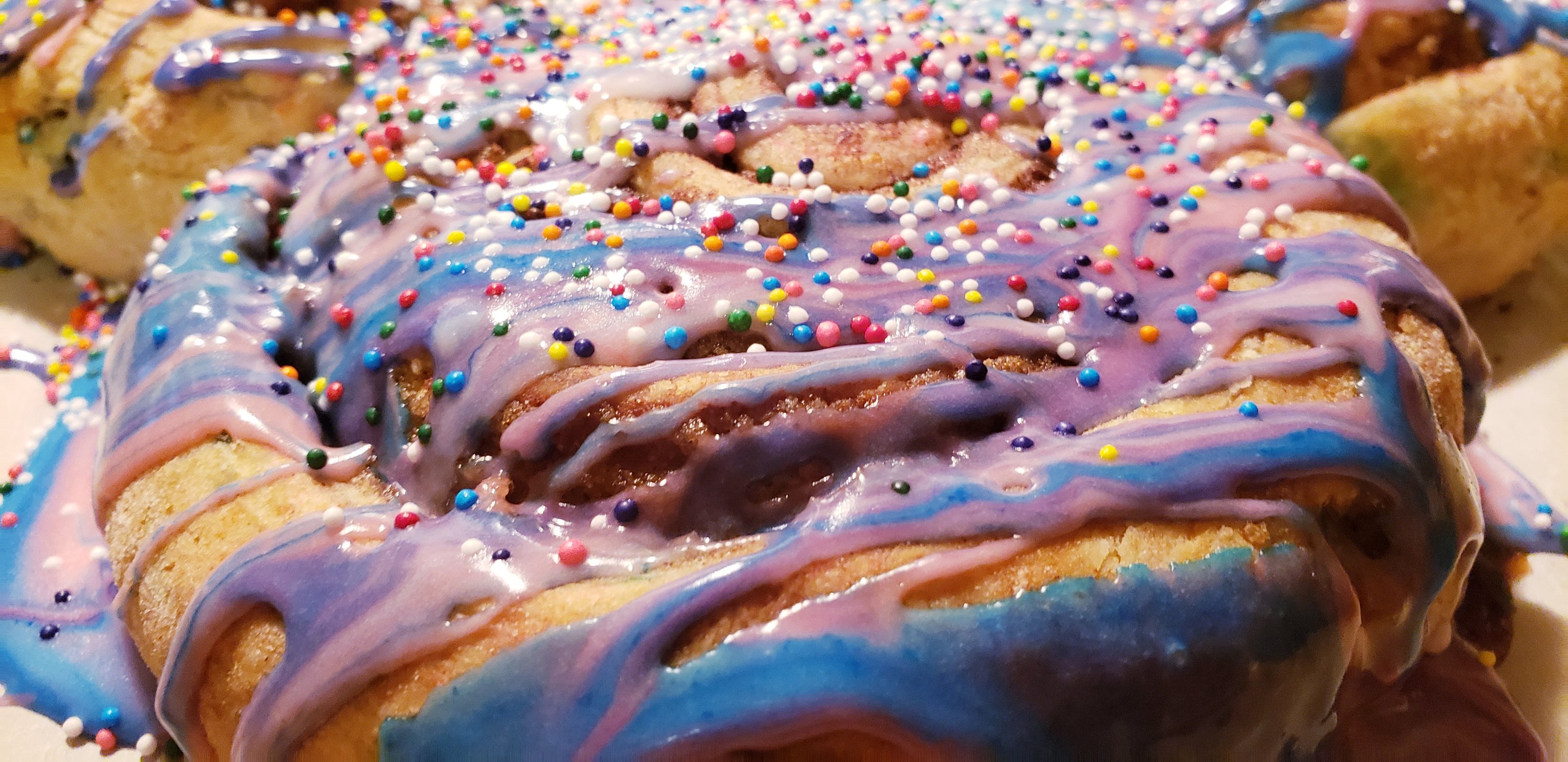 Hot, fresh cinnamon rollsSlathered in unicorn icing and sprinkles! Oh me. Oh my. Get into my belly now!