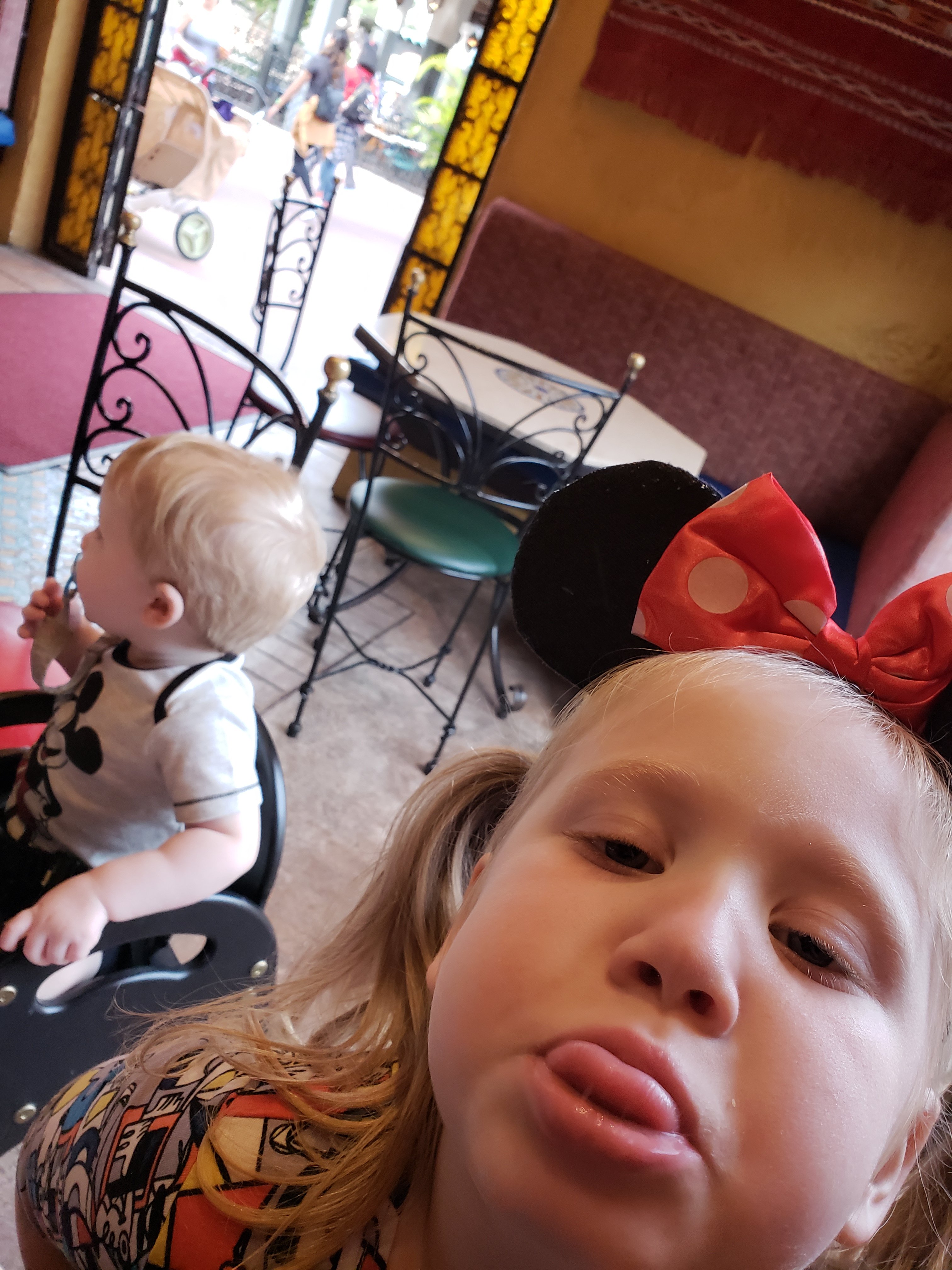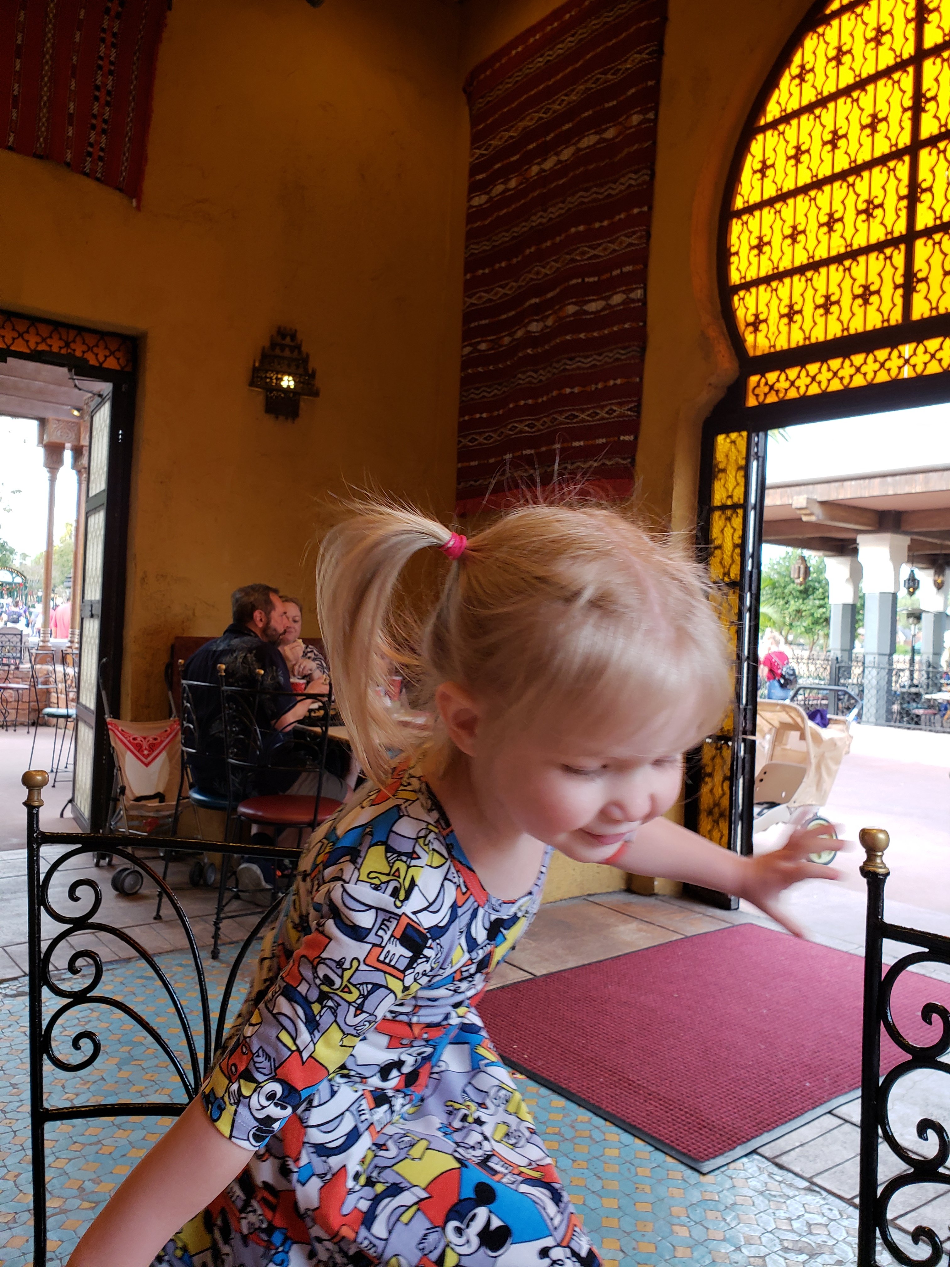 Speaking of the world,we love visiting the Morocco pavilion when at Epcot and eating at Tangierine Cafe, the quick service there. The hummus and pita bread are gobbled up quickly by the kids, while Mr. Mouse and I enjoy the shwarma. The views within that pavilion are amazing. The tile and iron work will take your breath away.
