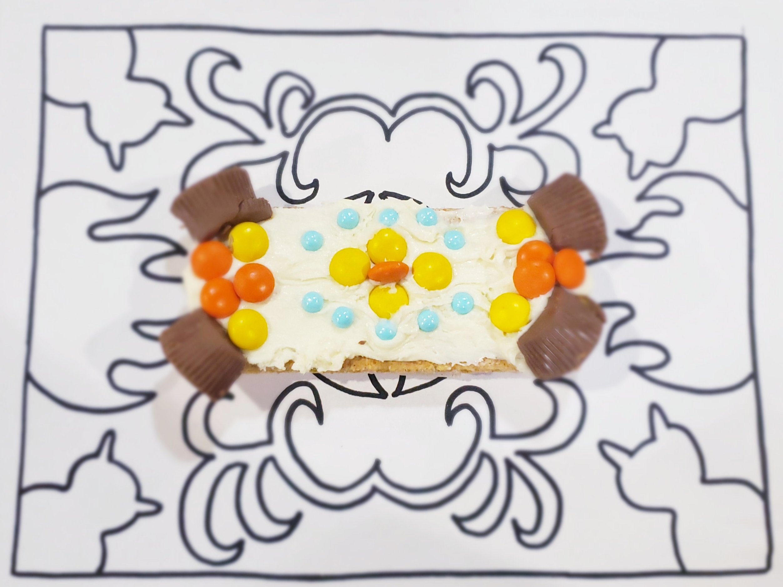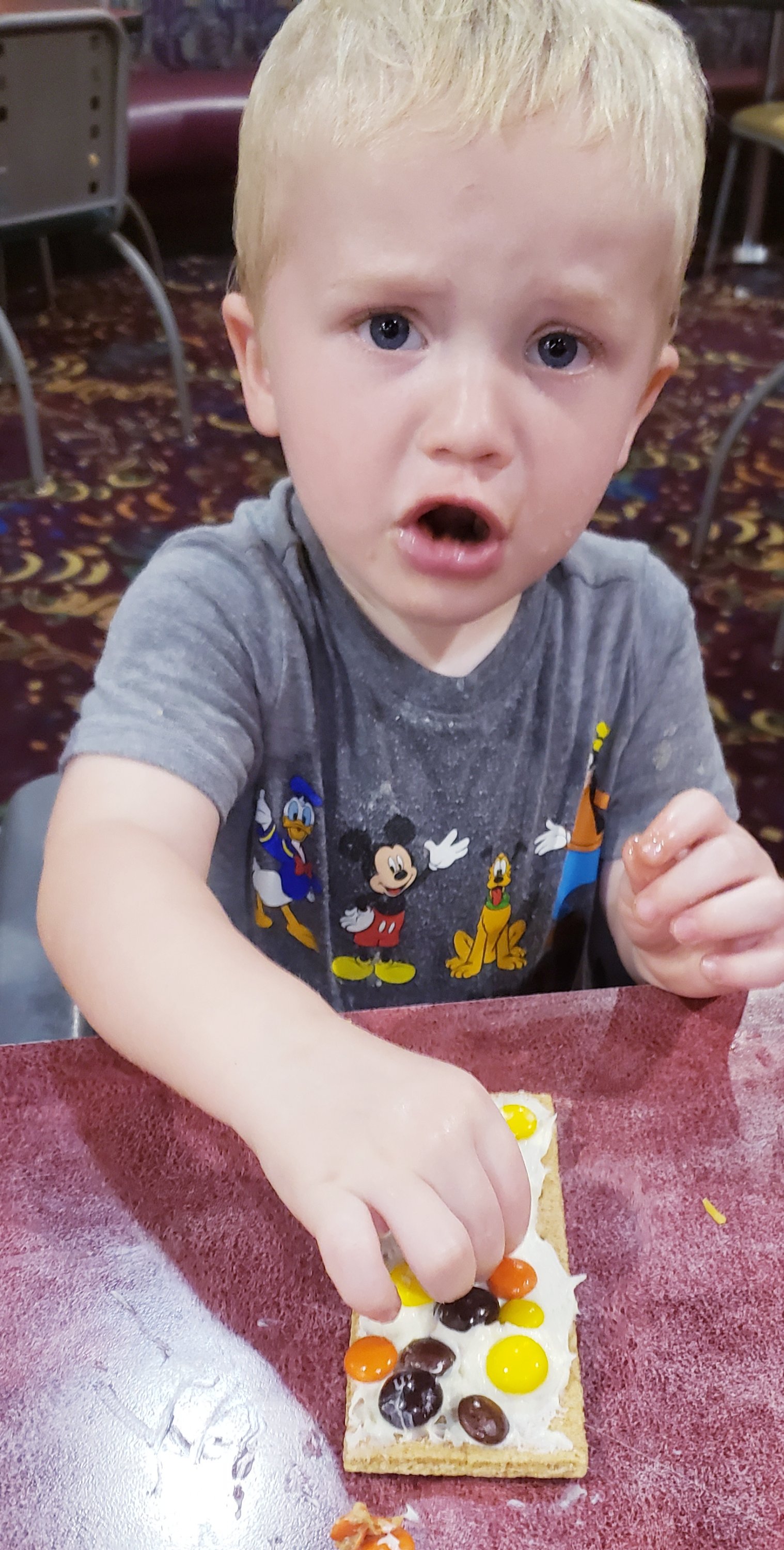 For dessert, we went interactive. My kids are in Montessori school, and they really focus on kids learning through hands on activity. I slathered cinnamon Graham crackers with canned vanilla frosting and let them try to replicate Aladdin’s magic carpet with whatever we had on hand. They used reese’s pieces, mini peanut butter cups, leftover pearl sprinkles from other nights, and even some of the candy from trick-or- treating at Mickey’s Not So Scary Halloween Party. Impressively, T. Mouse did the best job!
