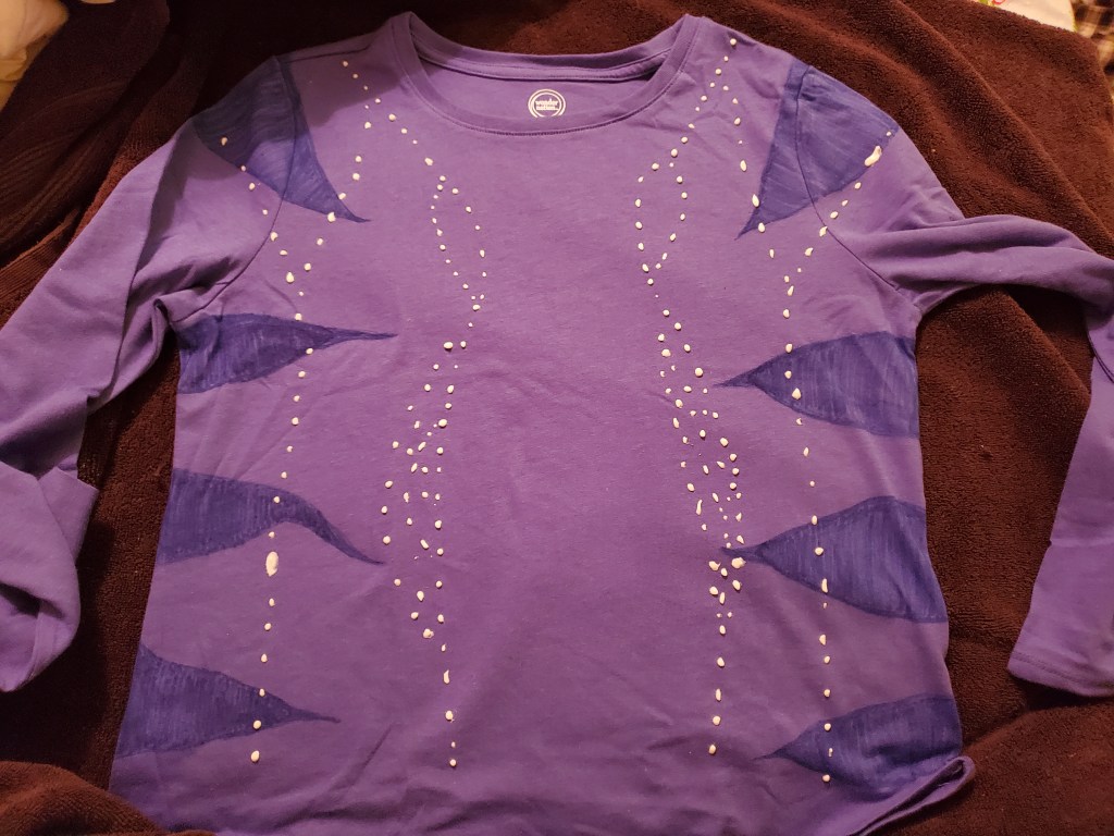 I lined the headdress with felt. Remember, it’s adhesive foam, so you need it to stick to something! Also, I added a few Na’vi stripes and that fun puffy paint.