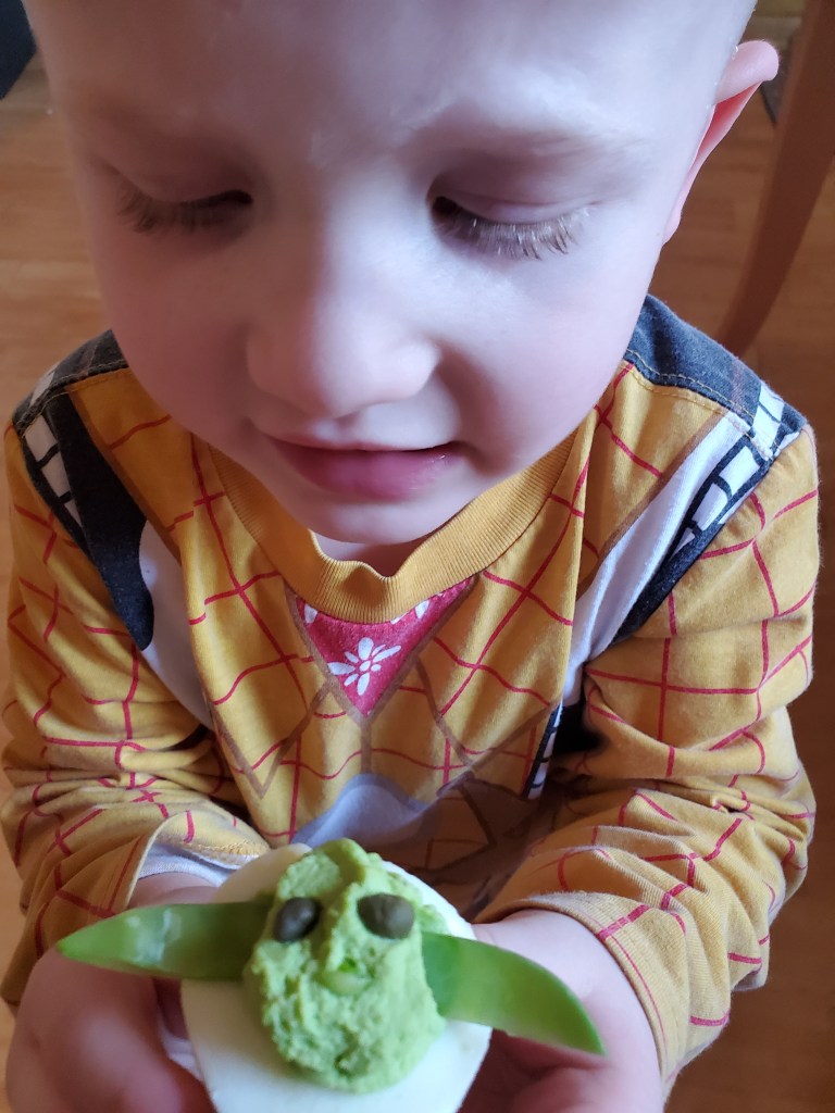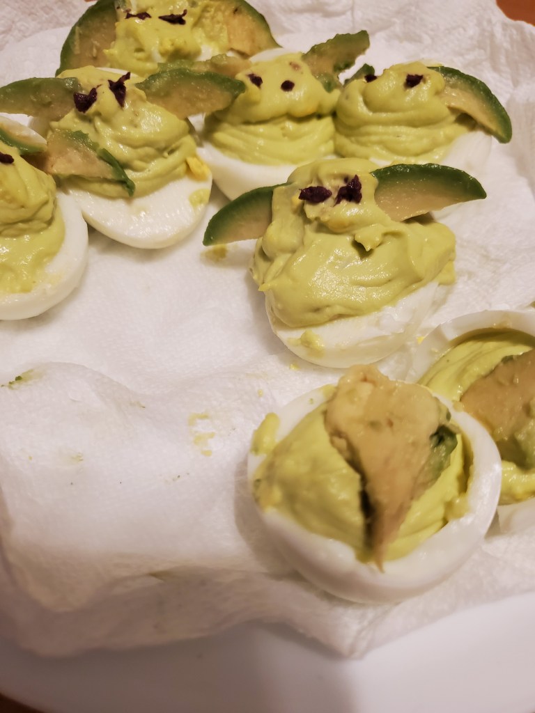Batch 2: They were a bit closer. My egg lids still cracked. The ears were impossible. I only got 2 decent Baby Yodas out of the whole batch. At least the leftovers made edible green egg salad sandwiches…