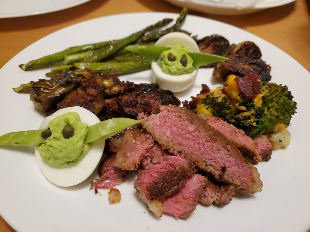 Baby Yoda eggs make a tasty addition to steak and veggies!