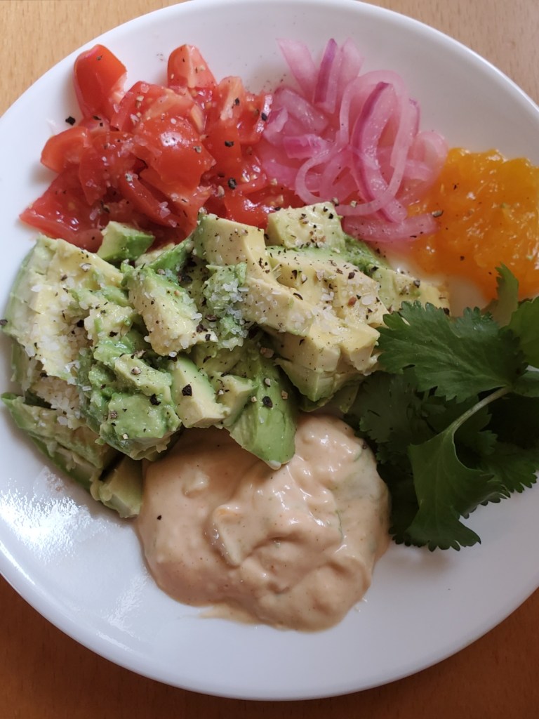 And it was delicious! The little bits of sweet tomato and mandarin played well with the sour onion and spicy mayo. The creamy salty avocado brought everything together. It was a perfect breakfast – every bite a little bit different.