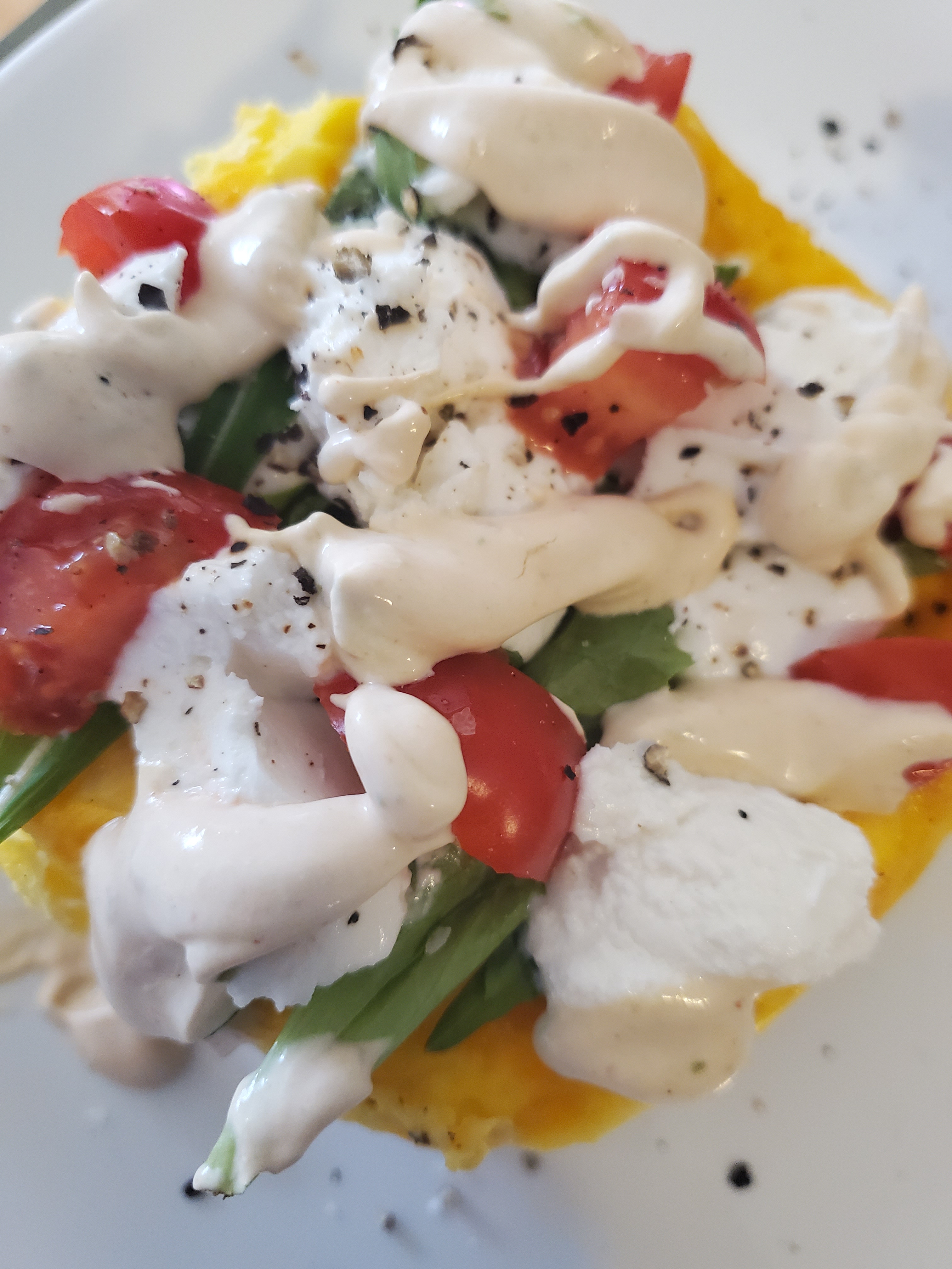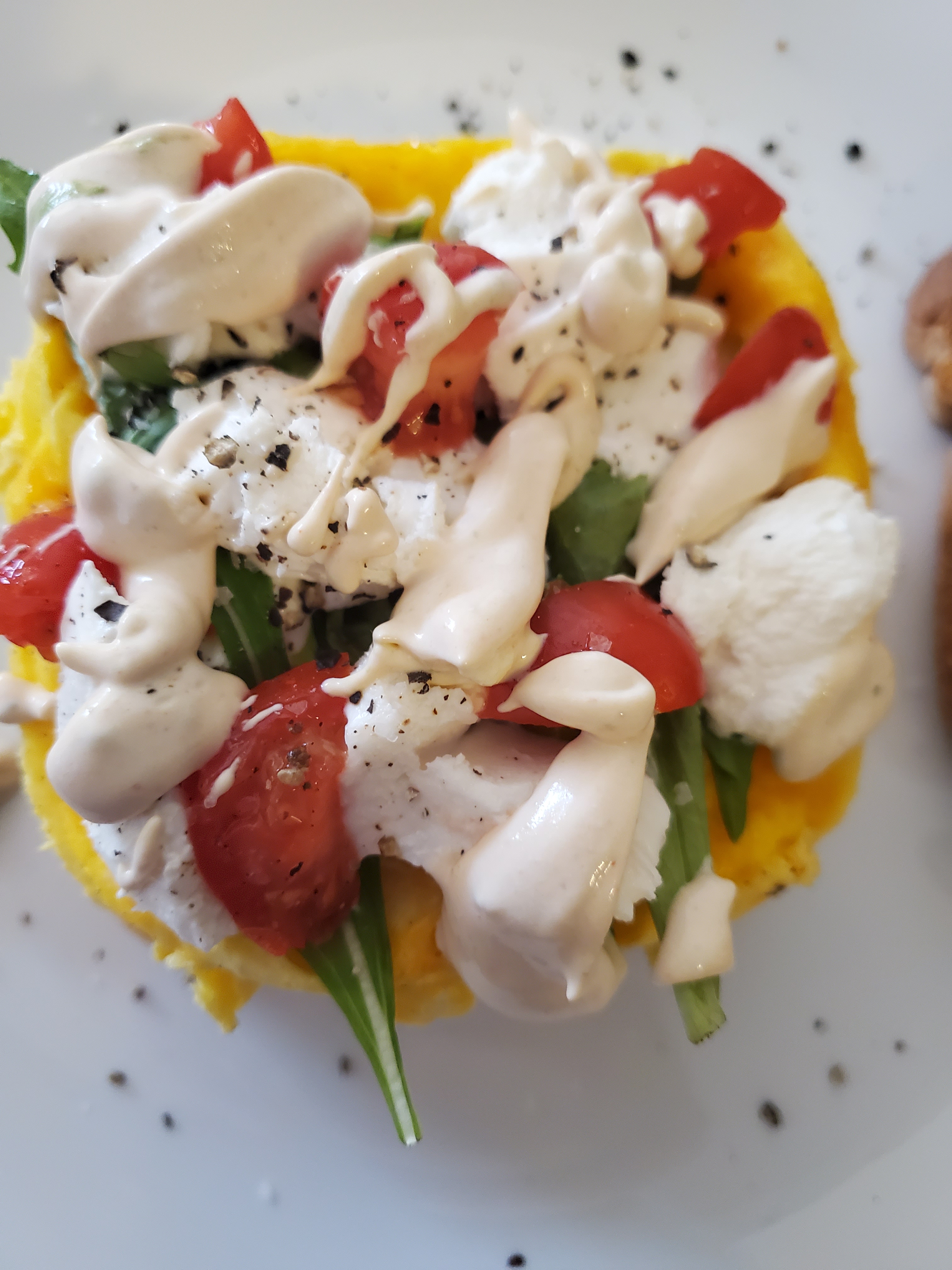 I topped with arugula, sliced cherry tomatoes, goat cheese, salt and pepper. I then drizzled my spicy sour cream over top. That was just 1T sour cream mixed with a few, or more, shakes if hot sauce.