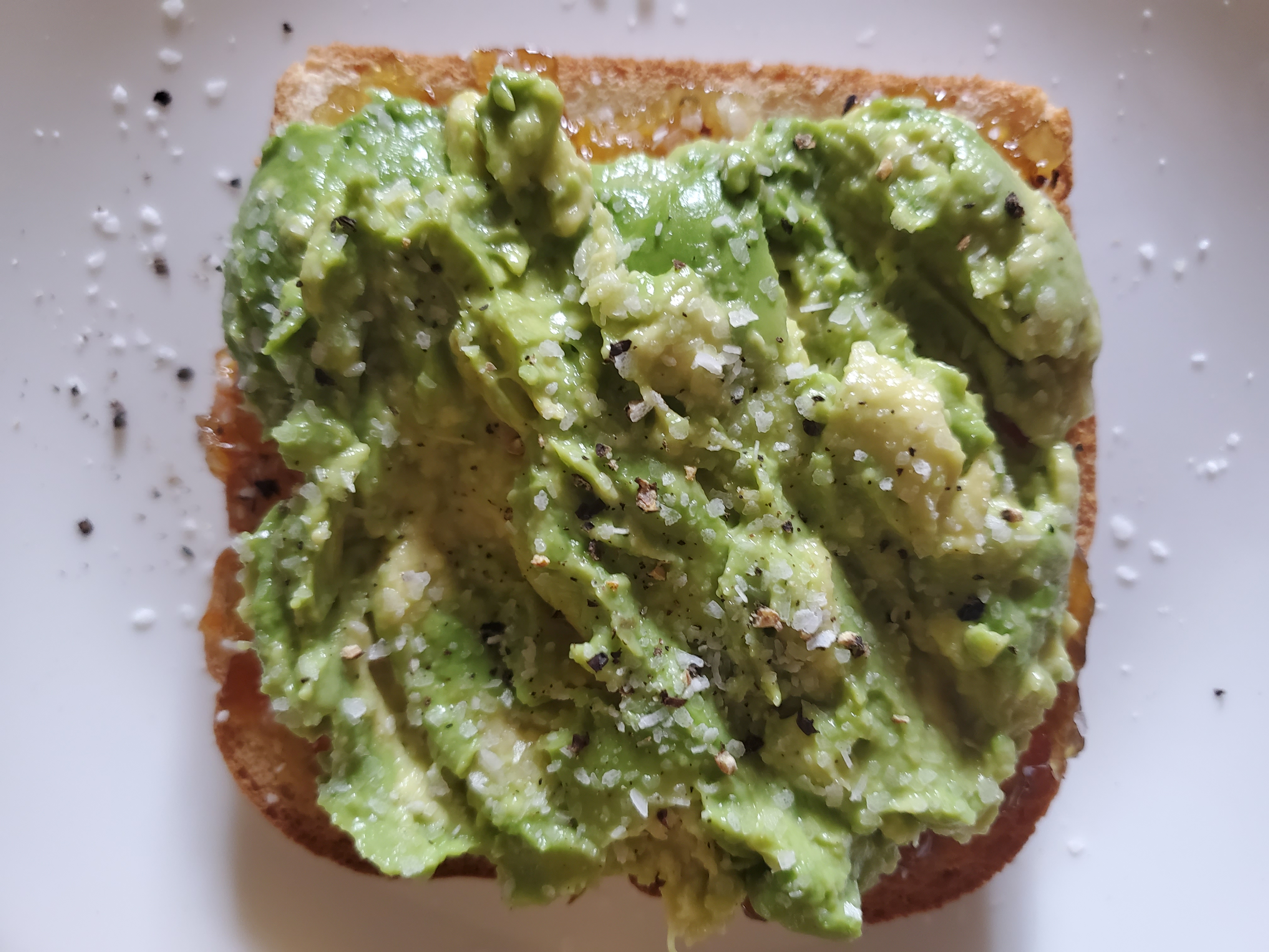 Then, ½ an avocado, mashed well, was spread all over that onion jam. We added salt and pepper to bring out the flavors.