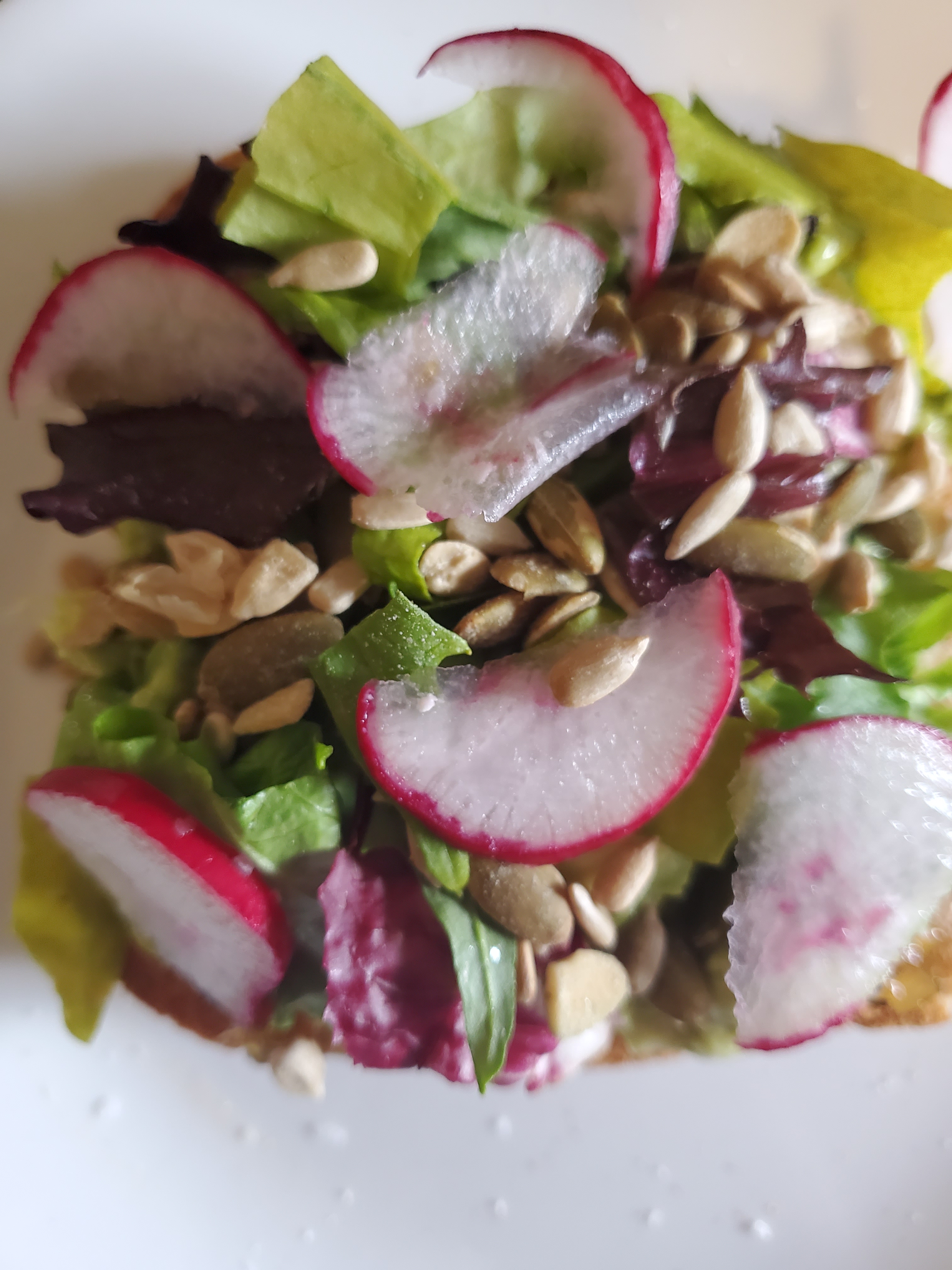 The description calls for watercress. We only have spring mix, so a few leaves of that topped the avocado.
