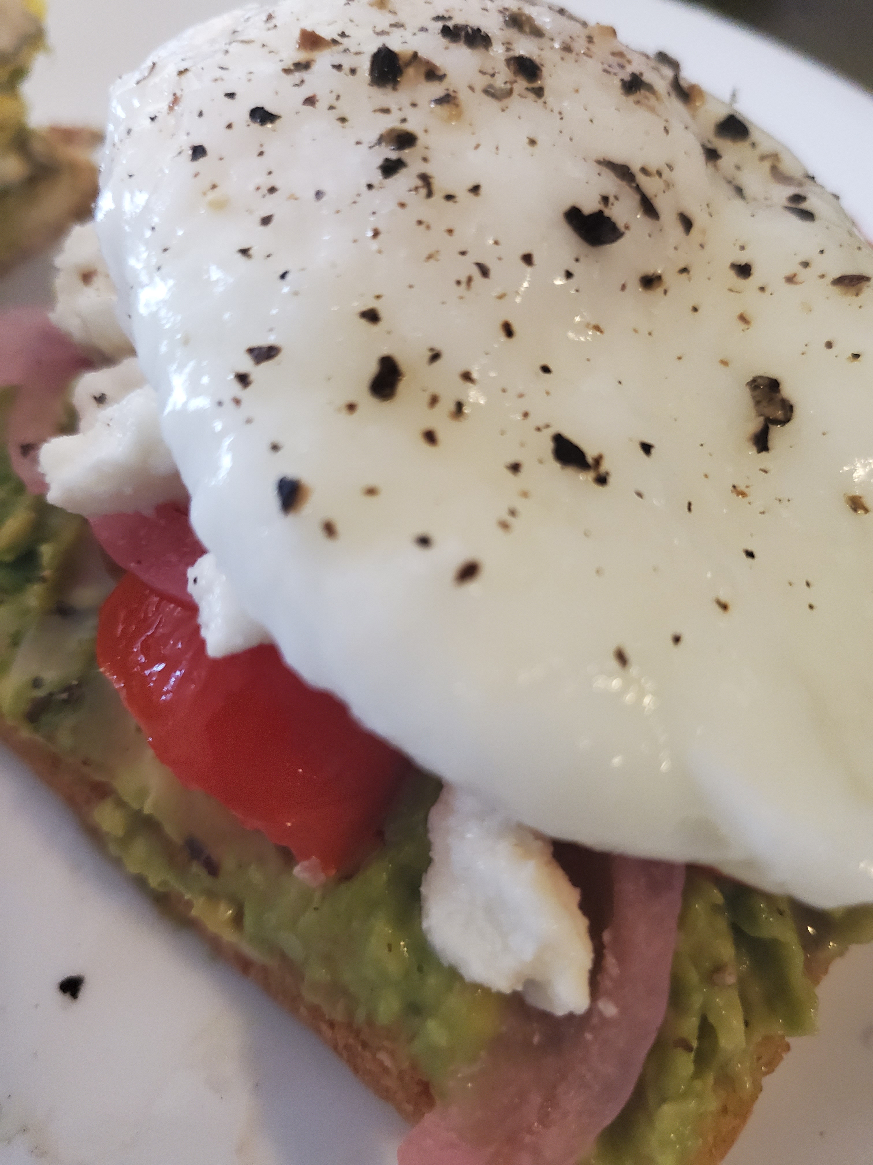 I started with super crunchy keto white bread toast. If you have read my other avocado toast posts, you will remember that this is where I take a my liberties with a recipe! Then, ½ smashed avocado, salted and peppered.