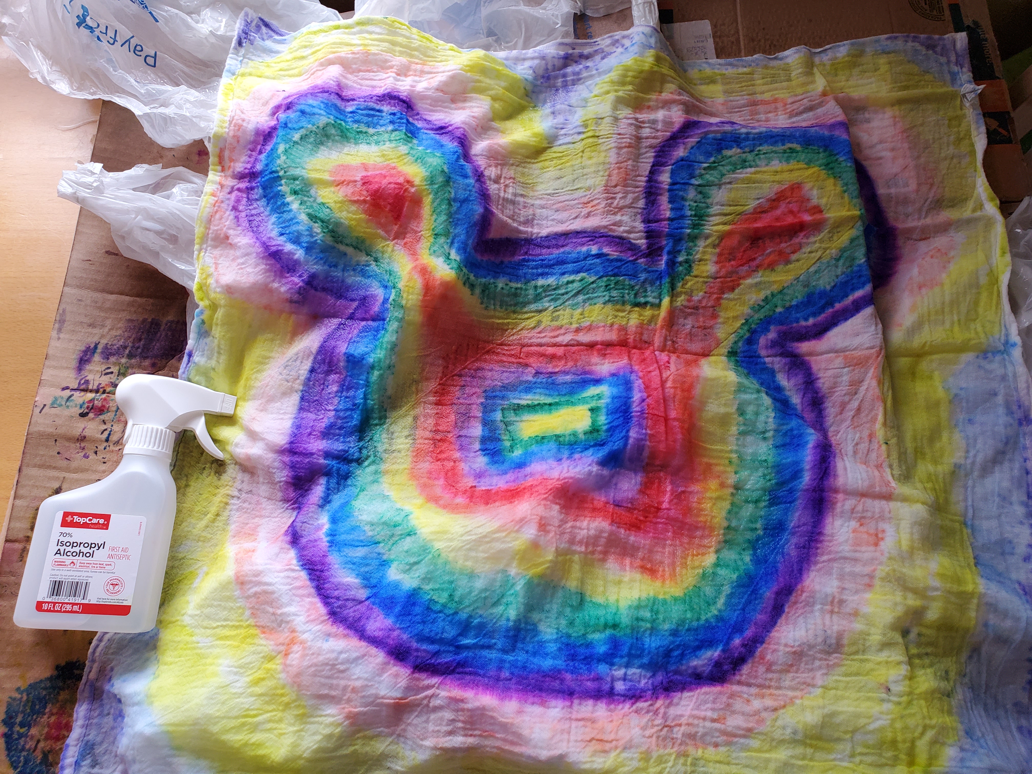 Draw your design! Whatever your heart desires. I found that using the side of the marker was better than using the tip for making more natural looking tie dye. Once your design is complete, either drop or spray alcohol over it. I have found that for more blurring, spritz everything with water first. That helps the rubbing alcohol drag the marker further.